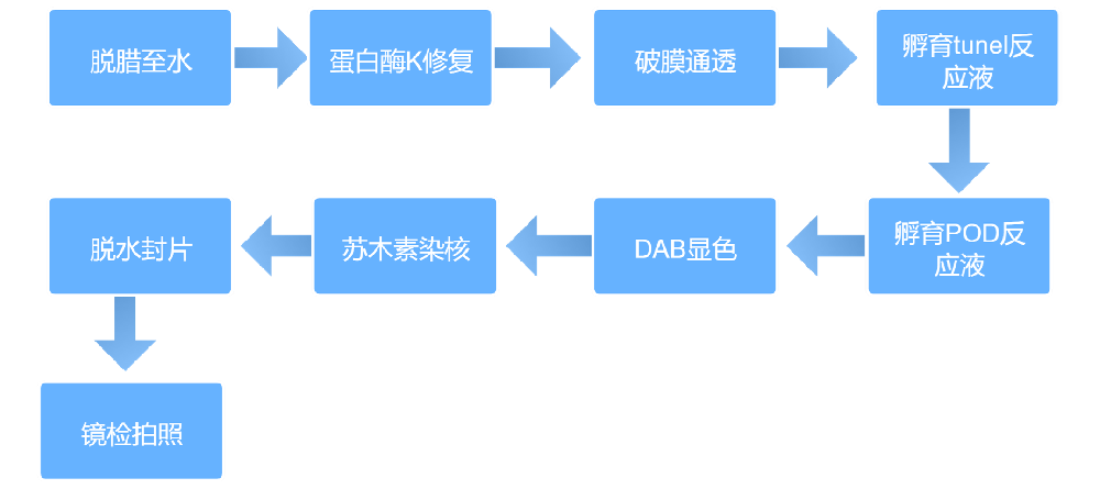晚期凋亡細胞中染色體DNA雙鏈或單鏈斷裂產生粘性3'-OH末端,在脫氧核糖核苷酸末端轉移酶(TdT)的催化下,將帶有生物素(Biotin)分子的dUTP,標記到DNA的3'-末端,隨后和辣根過氧化物酶(HRP)標記的鏈酶親和素Streptavidin(Streptavidin-HRP)結合,最后通過DAB顯色來顯示凋亡細胞,從而可以通過普通光學顯微鏡檢測到凋亡的細胞,這就是Tunel(TdT-mediateddUTPNick-EndLabeling)法檢測細胞凋亡的原理。